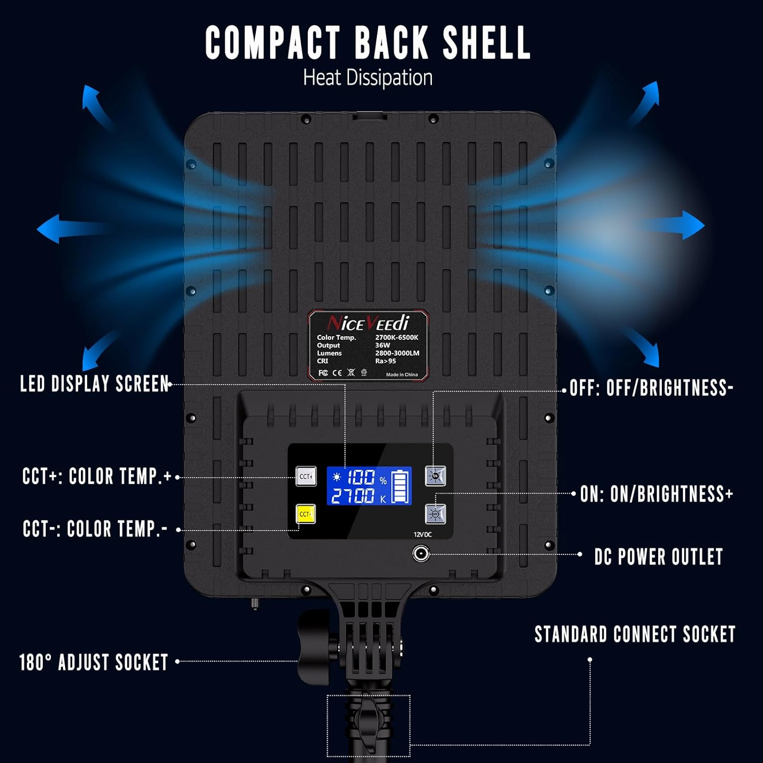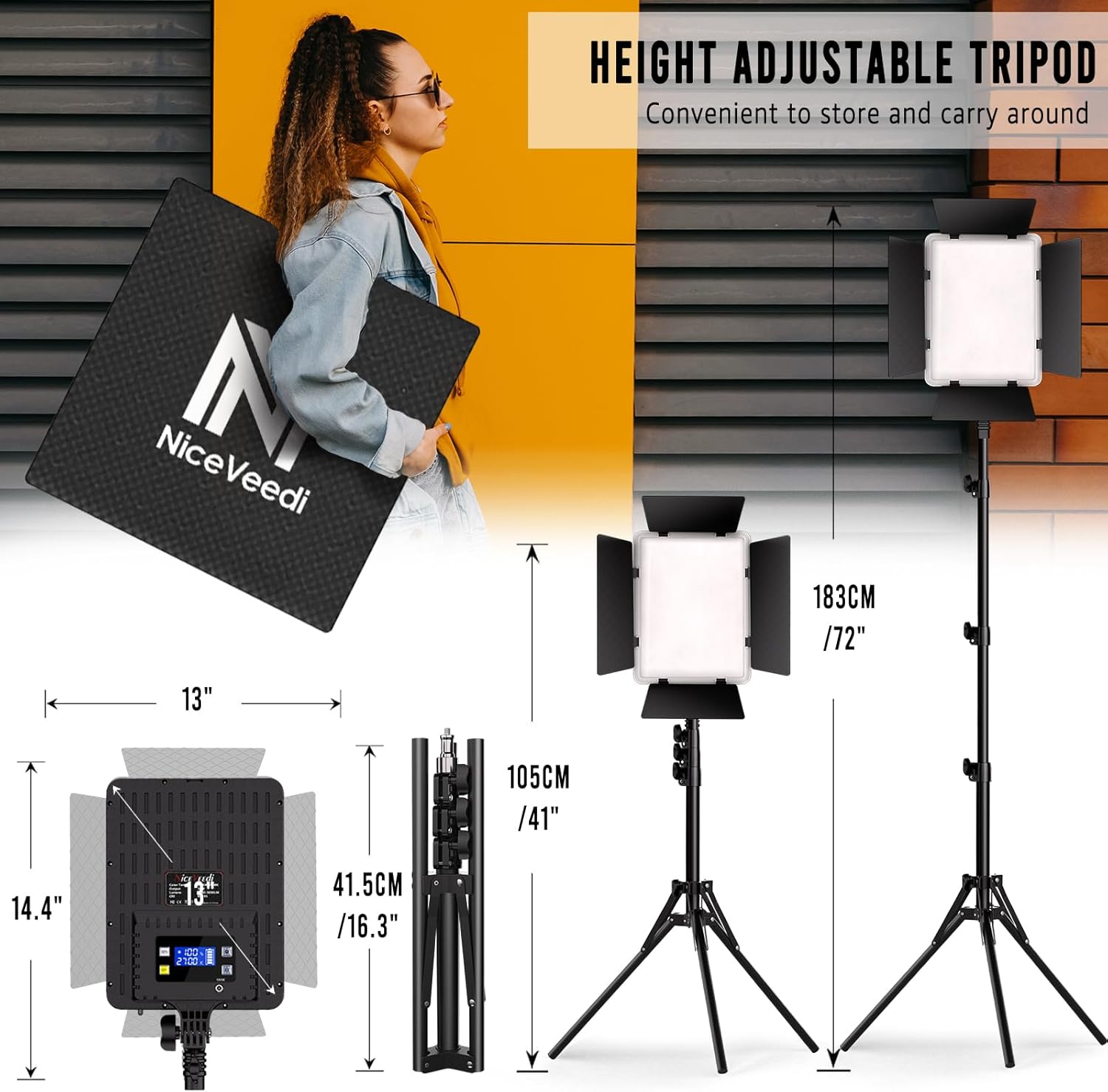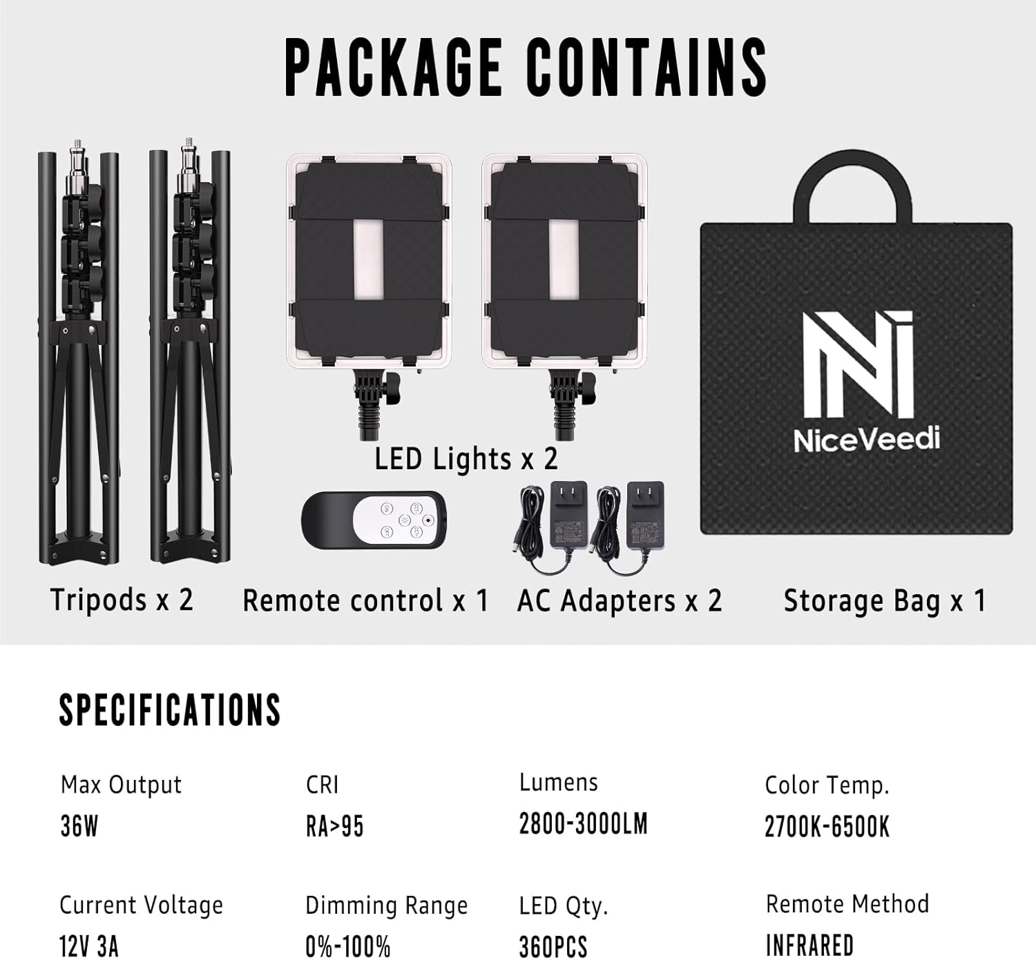 Introducing the NiceVeedi 2-Pack Photography Lighting Kit, a professional-grade lighting solution designed to elevate your video recording and photography projects to the next level. This kit includes two powerful 36W Bi-Color Studio Lights that offer adjustable color temperature ranging from 2700K to 6500K, ensuring versatile lighting options to suit any shooting environment.
